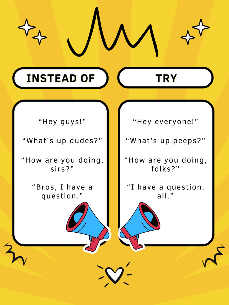 Here is a quick chart of suggestions on how you can acknowledge groups in gender neutral ways: