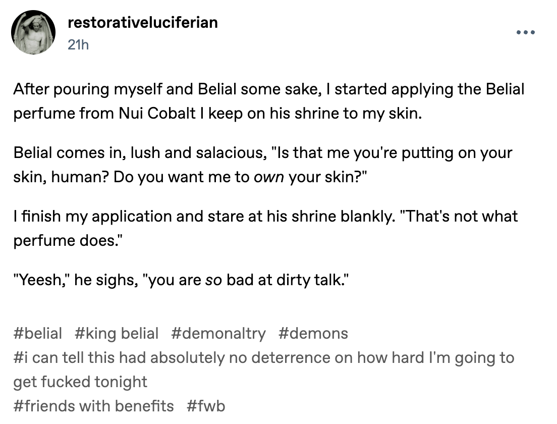 So last night when I planned my high with that chart above, I did so with Venus being in Pisces on the descendant. This is mostly because I take my gummies in the evenings and lately the most convenient times for highs happen to have planets coming up on the descendant. I also happen to know—you do not need to when planning these things—that Venus is currently in exaltation and she's the planet of love and sex. I don't know if that was what tipped me off or if Belial was hanging around prior to that, but suffice to say, we had a very fun night.