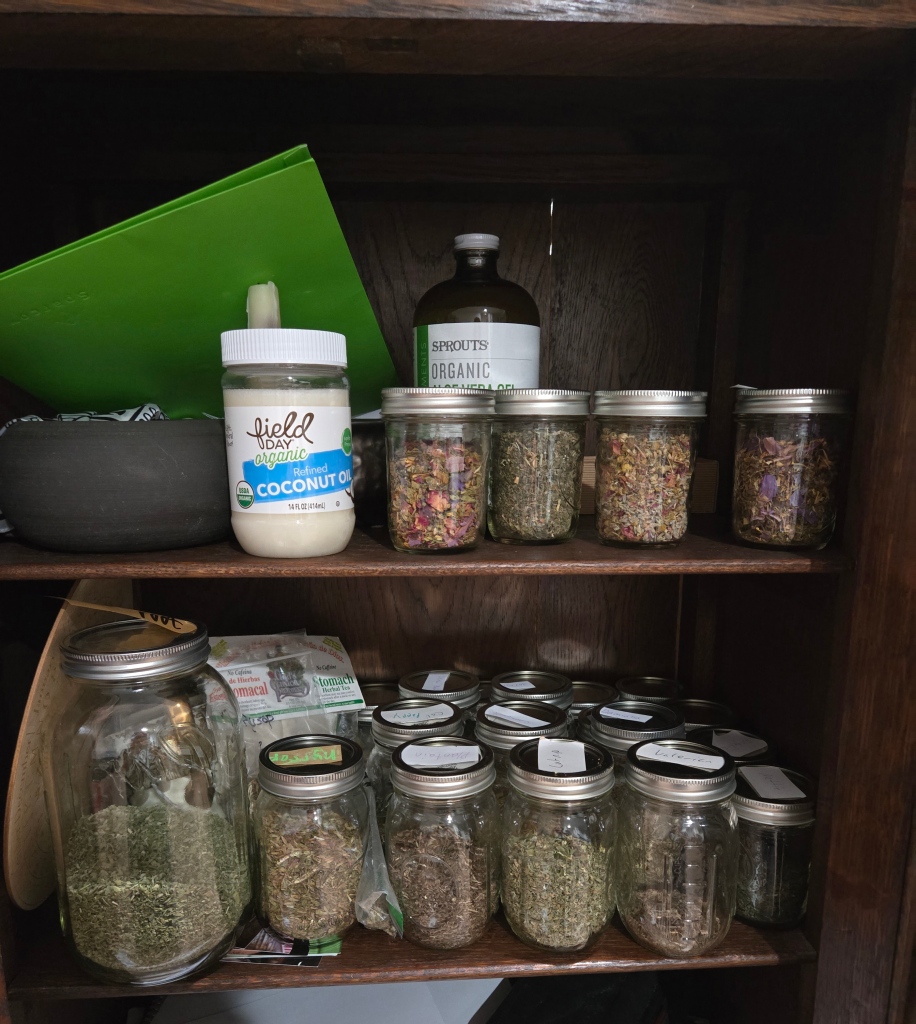 Over two years ago, when in retrospect my spiritual path was entering a new phase of maturity, I started doing some reading on herbalism. It occurred to me that I would like to build a home apothecary as a way of keeping organized herbs and products made from them in order to address common ailments. I then moved on with my life, literally taking it across the country, and eventually chalked up that desire to a particularly iconic example of how someone with neurodivergence can overestimate a hyperfocus.