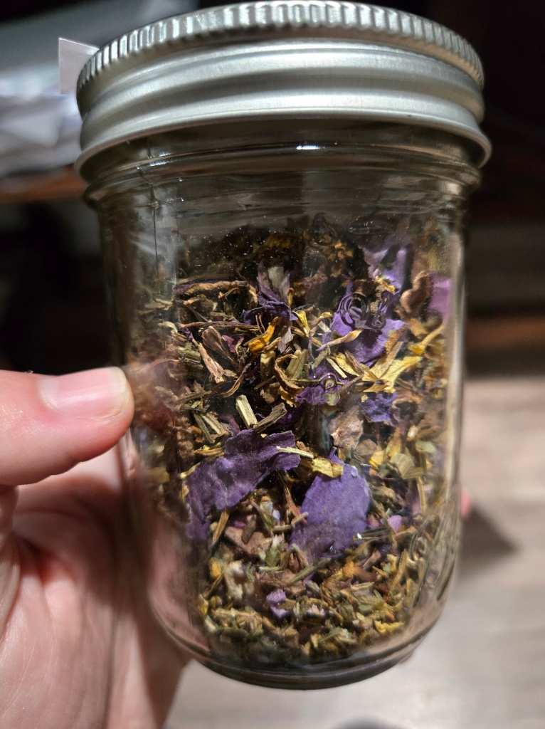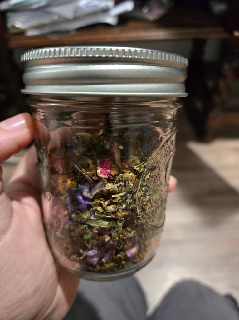 Additionally, I still need to sit with most of these herbs, introduce myself, give offerings, and get to know them. I feel like where my work is falling short so far is I haven't made the relationships I have wanted with most of the herbs, which leaves me using them when I should be partnering with them. As part of this, I hope to start growing some of the herbs myself once this next New Moon* passes.