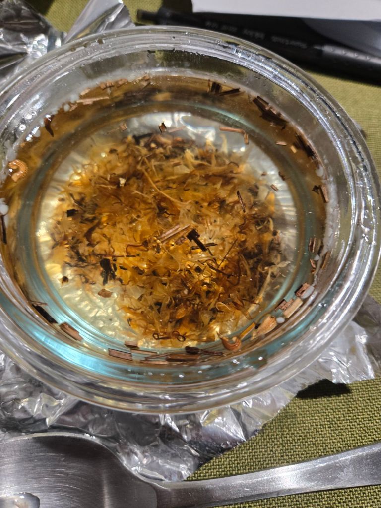 Once coconut oil is in a mostly or fully liquid form, put in the calendula and plaintain. Stir if you feel like it, but mine mostly ended up on the bottom and you should be fine if not. Cover container with aluminum foil.