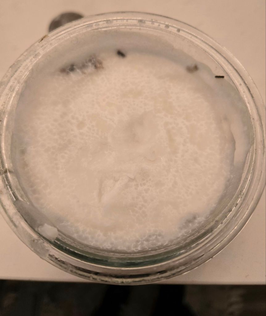 Sprinkle in the beeswax. When the pellets start to melt, stir to encourage even mixing. Wait for salve to cool and solidify, which will take overnight to finish.
